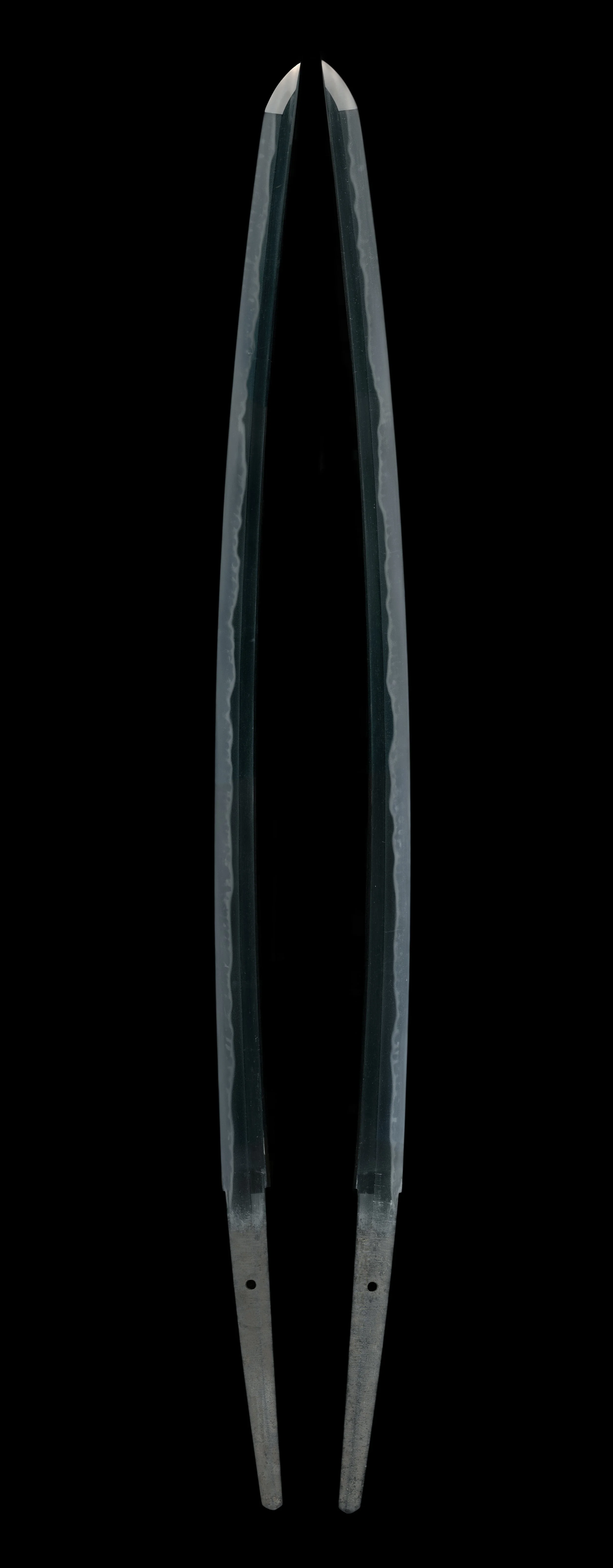 The jigane is the classic bright konuka-hada for which the Hizen school is celebrated, displaying a fine, well-grained steel surface of exceptional quality. The hamon is a bold and wide gunome Choji-midare. Plenty of Ashi can be seen within the Hamon.