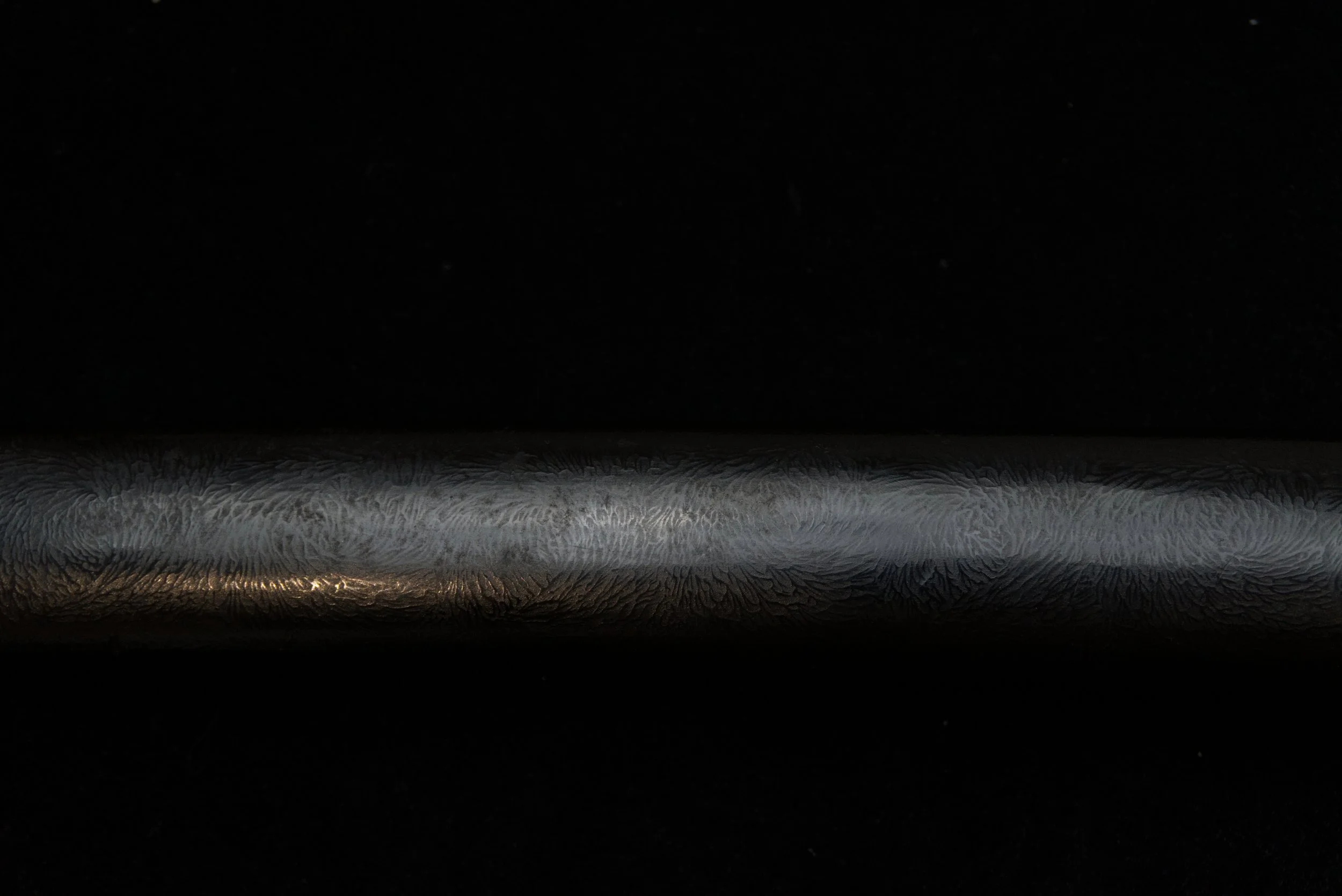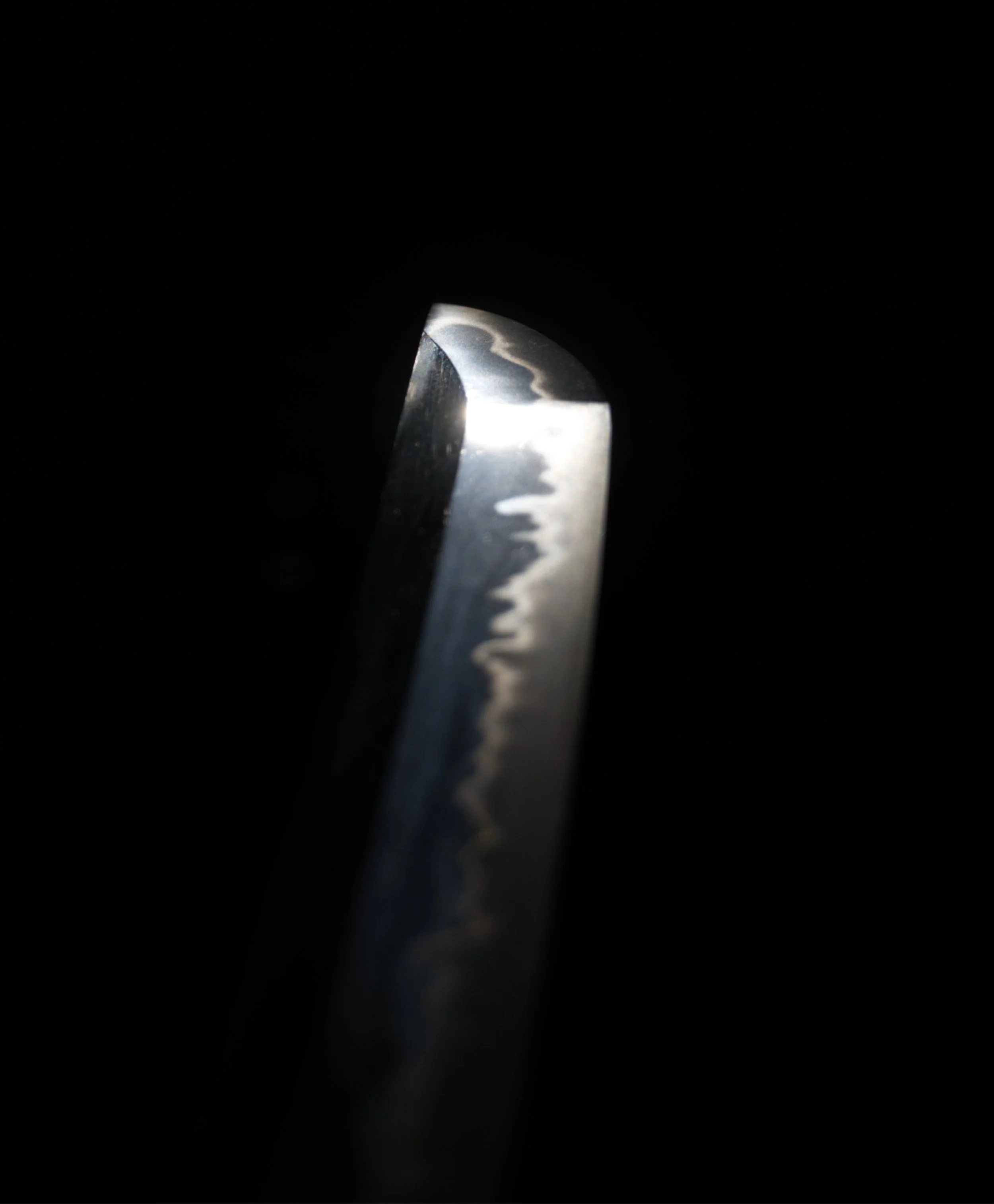 This blade is constructed in shinogi-zukuri with an iori-mune, presenting a powerful and well-balanced sugata. With a nagasa of 84.2 cm, it is exceptionally long, far exceeding the average for the period, and immediately commands attention. The proportions are particularly appealing, featuring a thick kasane and an extended chū-kissaki. The kissaki itself is especially sharp in appearance. Personally, I find the overall shape extremely attractive, with a strong yet elegant profile that reflects both function and intention. The jigane is forged in the Bizen tradition, closely reflecting the style of his master, Koyama Munetsugu. It displays a very tight and well-forged ko-itame hada, characteristic of Bizen workmanship, with a clean and controlled surface.