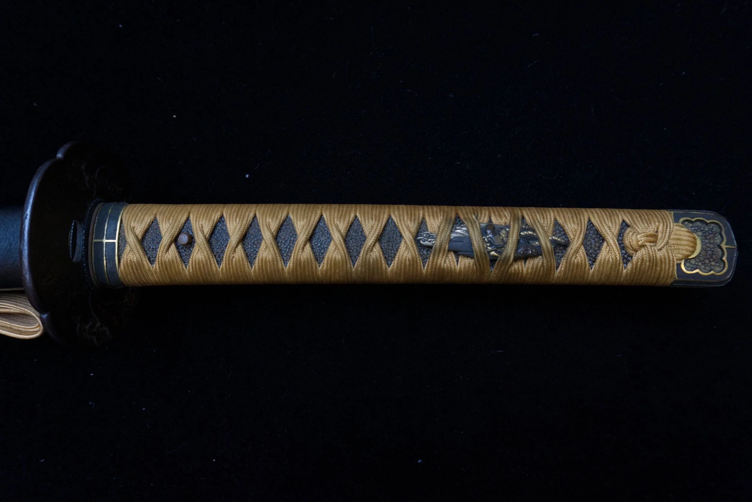 This blade comes with a Bakamatsu period koshirae, consistent with the late Edo aesthetic where practicality and restrained design were emphasized. The mounts reflect the functional style typical of the period, with a cohesive and understated appearance. The Tsuka is very long, matching the long nakago and nagasa of the blade. The saya is finished in a black kinma urushi style lacquer. This blade was made in 1852, one year before Mathew Perry arrived to Japan.